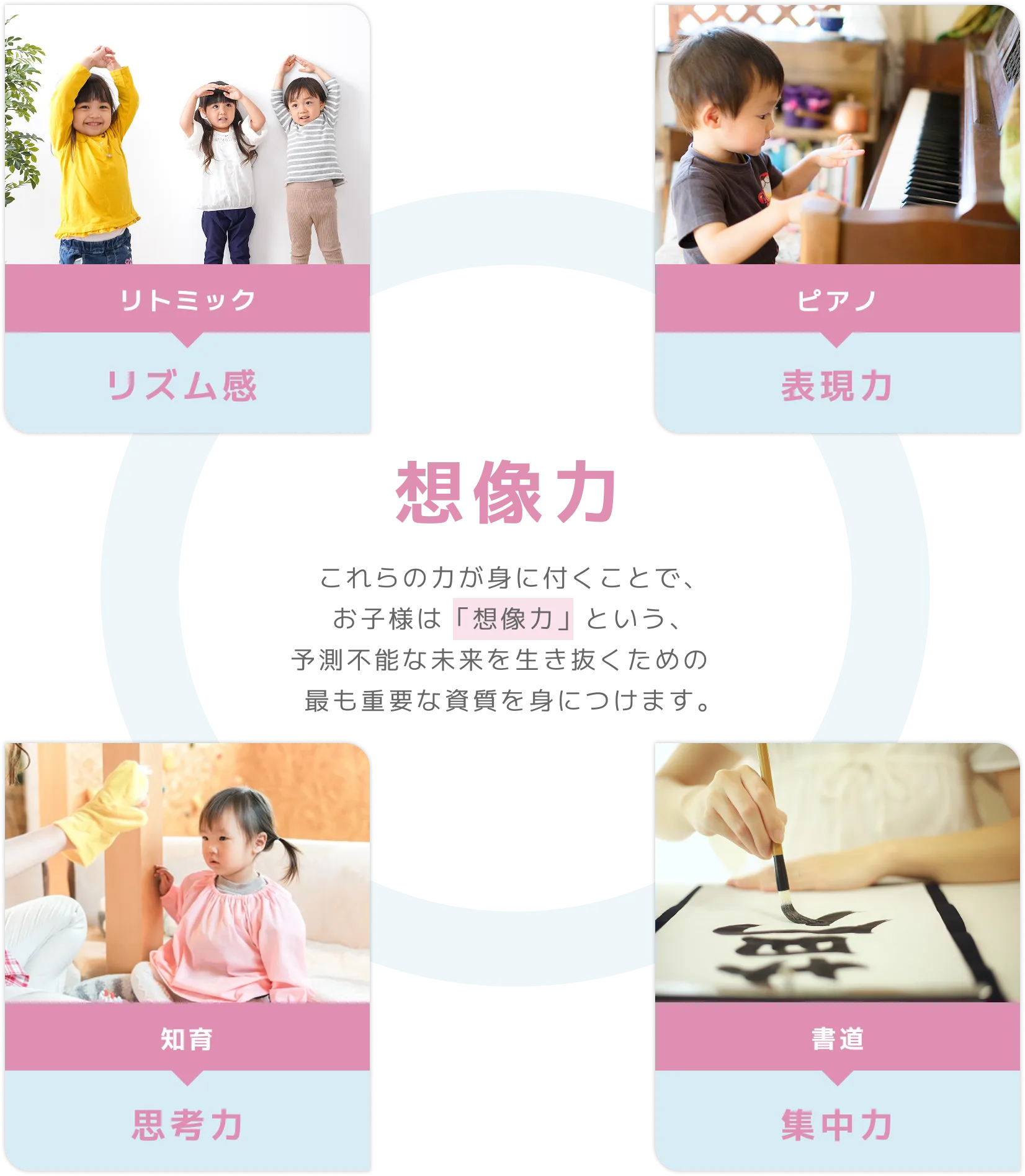 リズム感・表現力・思考力・集中力これらの力が身に付くことで、お子様は「想像力」という、予測不能な未来を生き抜くための 最も重要な資質を身につけます。