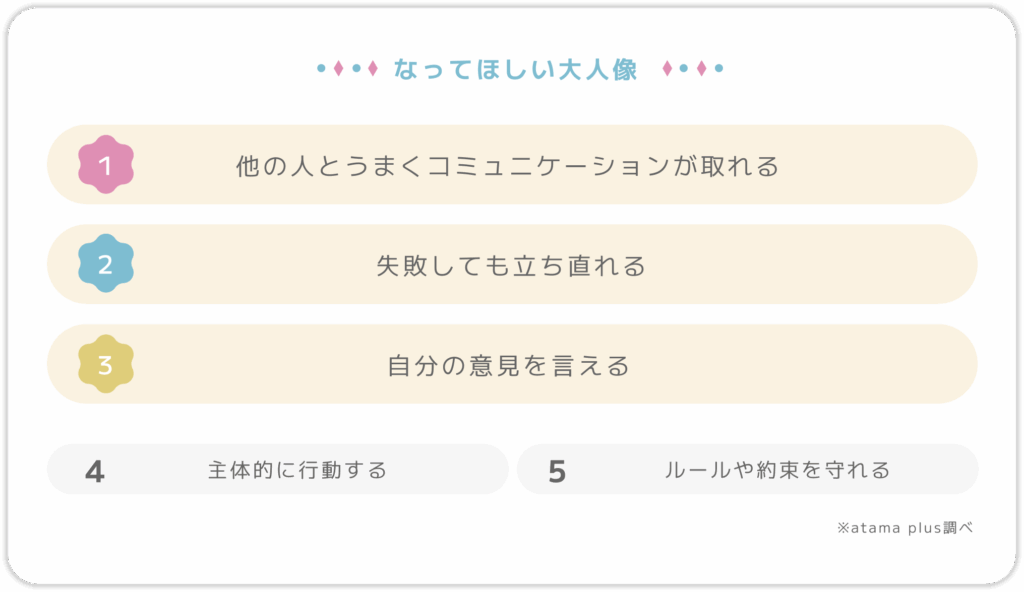 子どもに求める力は他者との円滑なコミュニケーションと、最終的に自分で判断できる力です。