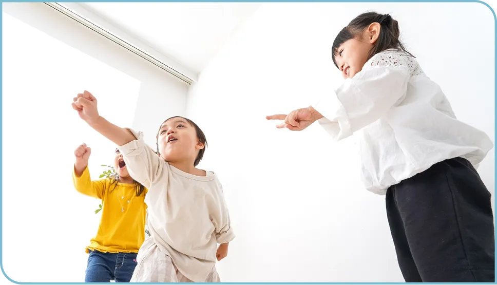 日常の物事(野菜、動物、日常生活、色かたち、、)をリズムに乗せて模倣しながら覚えていきます。