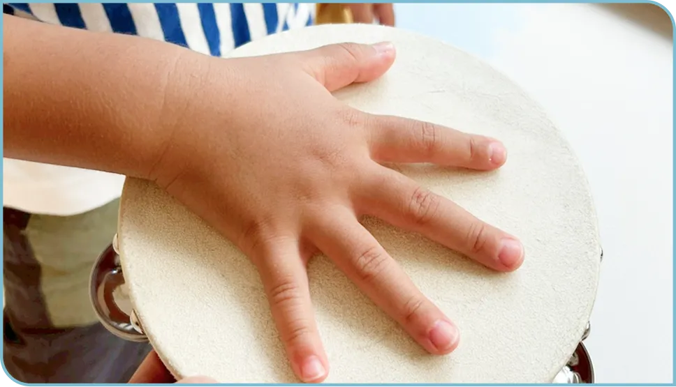 歌から感じるリズムやストーリーを想像し、それらを楽器、道具、身体を使い表現することで音楽の体験をします。タンバリンを使い先生のリズムを模倣することでリズム感を養います。